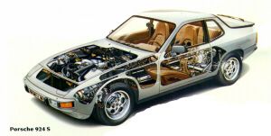 auszusehen hätten. Die laufenden Verschärfungen der amerikanischen Abgasvorschriften und die beginnende Schadstoffreglementierung in den übrigen Industriestaaten der Welt beeinflussten den Entwicklungstrend der weltweiten Automobilindustrie. Speziell die Motorentechnik wurde stark beeinflusst, zumal auch dem hohen Kraftstoffverbrauch und der Geräuschentwicklung der Fahrzeuge der Kampf angesagt wurde. Literleistungen von 80PS/Liter brachte in den sechziger Jahren zum Beispiel der 911-Motor. Die Erkenntnis, dass die Abgasvorschriften nur mit geringeren spezifischen Leistungen erreicht werden könnten, führte zur Entwicklung großvolumiger, niedertouriger Motoren. Diese Theorie wurde auch bei Porsche diskutiert. Wie würde sich in Zukunft ein 911-Motor den geänderten Bedingungen anpassen können? Man war zu jener Zeit wenig optimistisch. Ein hubraumstarker Motor, man sprach von 5 bis 8 Liter Hubraum, könnte nicht mehr luftgekühlt sein und als wassergekühlter Motor auch nicht mehr im Heck untergebracht werden. Da blieb also nur der Einbau eines wassergekühlten Motors im Bug, ein für Porsche - Ingenieure zu damaliger Zeit wahrlich ungewohnter Gedanke. Wenn schon der Motor vorne ist, dann musste möglichst viel Gewicht auf die Hinterachse, die ja auch richtigerweise die angetriebene sein sollte, gelegt werden. So entstand die Transaxle - Bauweise , also Motor vorne, Getriebe an der angetriebenen Hinterachse. Die ersten konkreten Untersuchungen galten dem neu zu entwickelnden Typ 928. Ein Achtzylinder-V8-Aluminium-Motor mit 5 Liter Hubraum war als Antriebsaggregat vorgesehen. Da dieses Kraftpaket unter einer flachen Motorhaube liegen sollte, wurden die Ventile und der Ventilantrieb so angeordnet, dass der Motor eine geringe Bauhöhe erreichte und möglichst viele der peripheren Bauteile im offenen V untergebracht werden konnten. Während die Entwicklung dieses vollständig neuen Wagentyps intensiv betrieben wurde, lief bei Porsche eine weitere Fahrzeugentwicklung als Nachfolger für den Mittelmotor - Sportwagen Typ 914. Hier sollte ein ebenfalls im Bug eingebauter wassergekühlter Vierzylinder - Reihenmotor von 2 Liter Hubraum ausbaufähige Voraussetzungen für weitere Modellentwicklungen geben. Was unsere Ingenieure für den 928 für richtig hielten, musste doch auch für den etwas kleiner gehaltenen 914 - Nachfolger gelten. Somit waren auch für diesen Typ die Entwicklungsweichen gestellt, und zwar zur Transaxlebauweise. Die Entwicklungszeiten waren sehr kurz, musste doch hier erstens ein bestehender Typ ersetzt werden, zweitens waren die bereits gemachten Erfahrungen von der 928-Entwicklung für diese Bauweise von ausschlaggebendem Nutzen, und drittens waren wesentliche Baugruppen, wenn auch teilweise abgeändert, aus Kostengründen von der Großserie zu übernehmen. 1972 wurde mit der Studienphase begonnen, Prototypen wurden gebaut und erprobt, ab Frühjahr 1974 begann man mit der Beschaffung der Serienwerkzeuge. Im Frühjahr 1975 fiel dann die Entscheidung, dass der 914-Nachfolgetyp in Porsche - Verantwortung gebaut und vertrieben wird, wobei als Produktionsstätte das Werk Neckarsulm, etwa 40km von Stuttgart - Zuffenhausen entfernt, ausgewählt wurde. In Neckarsulm arbeiten Automobilbauer, die vom selben schwäbischen Tüftlergeist beseelt sind wie das Porsche - Team in Stuttgart. Hier war der 924, wie er von da an heißen sollte, in richtigen Händen. Anfang Herbst 1975 begann der Aufbau der ersten Fahrzeuge. Ab Januar 1976 startete die geplante Produktion, und mit Anlauf des US-Typs im April 1976 kam das Produktionsband richtig in Fahrt. Es gab Monate , in denen bis zu 2500 Fahrzeuge den Zählpunkt 8, so wird die Endkontrolle bezeichnet, durchliefen. Bleiben wir beim 924, zumal der 928 noch in der Erprobungs- und Werkzeugerstellungsphase lief. Wie präsentierte sich der 924 im Jahre 1976 dem fachkundigen Publikum? Vierzylinder - Reihenmotor mit 2 Liter Hubraum und K- Jetronic - Einspritzung. 125 PS leistet dieser von Porsche modifizierte Audi - Motor. In abgasentgifteter US-Version brachte er 110 PS, dann ab Februar 1977 115 PS. Transaxle -Bauweise mit 4-Gang-Getriebe an der Hinterachse und ab 1977 auch mit einem 3-Gang-Automatik-Getriebe. Besonders erwähnenswert war der damals noch gar nicht als so bedeutend anerkannte Cw-Wert von 0,36. Diese Kenngröße, beziehungsweise das Produkt von Stirnfläche mal dem Luftwiderstandsbeiwert (0,36 X 1,76 m2 = 0,634), war die günstigste der damals angebotenen Serien - Straßenfahrzeuge. Daher ist es verständlich, dass dieser Fahrzeugtyp bei gleicher Motorleistung mehr als zehn Produktionsjahre lang in Europa und speziell in der Bundesrepublik ein nach wie vor beliebter Wagentyp blieb. Über 200 km/h (= 125 Miles/h) Spitze auf den bundesdeutschen Autobahnen, und das mit einem äußerst geringen Kraftstoffverbrauch, darin liegt der Reiz dieses Fahrzeugs. Kein Wunder, dass die Kundschaft nach einem 5-Gang-Getriebe verlangte. Diese Neukonstruktion war ab Sommer 1978 lieferbar. Für das Fahrwerk wurde als Vorderachse eine McPherson - Achse, als Hinterachse eine Schräglenkerachse gewählt. Diese Bauweisen waren aus der 911- und der 914-Entwicklung wohlbekannt und konnten durch entsprechende Anpassungen an die neuen, veränderten Erfordernisse kurzfristig weiterentwickelt werden. Durch Verwendung von etlichen Großserienteilen - teils unverändert, teils modifiziert - konnten die Kosten in Grenzen gehalten und das Entwicklungsrisiko minimiert werden. Die Vorderachse erhielt Schraubenfedern, die zentrisch um die McPherson - Federbeine angeordnet wurden. Die Radführung übernahm ein Querlenker, der teils an der Karosserie, teils am Motorträger, der auch zur Aufnahme der Lenkung dient, gelagert wurde. Als Lenkung wurde eine Zahnstangenlenkung vorgesehen, die über eine dreigeteilte, abgewinkelte Sicherheitslenksäule mit dem Lenkrad verbunden ist. Die Schräglenker der Hinterachse werden an einem Querrohr aufgenommen ,in dem auch die Federst